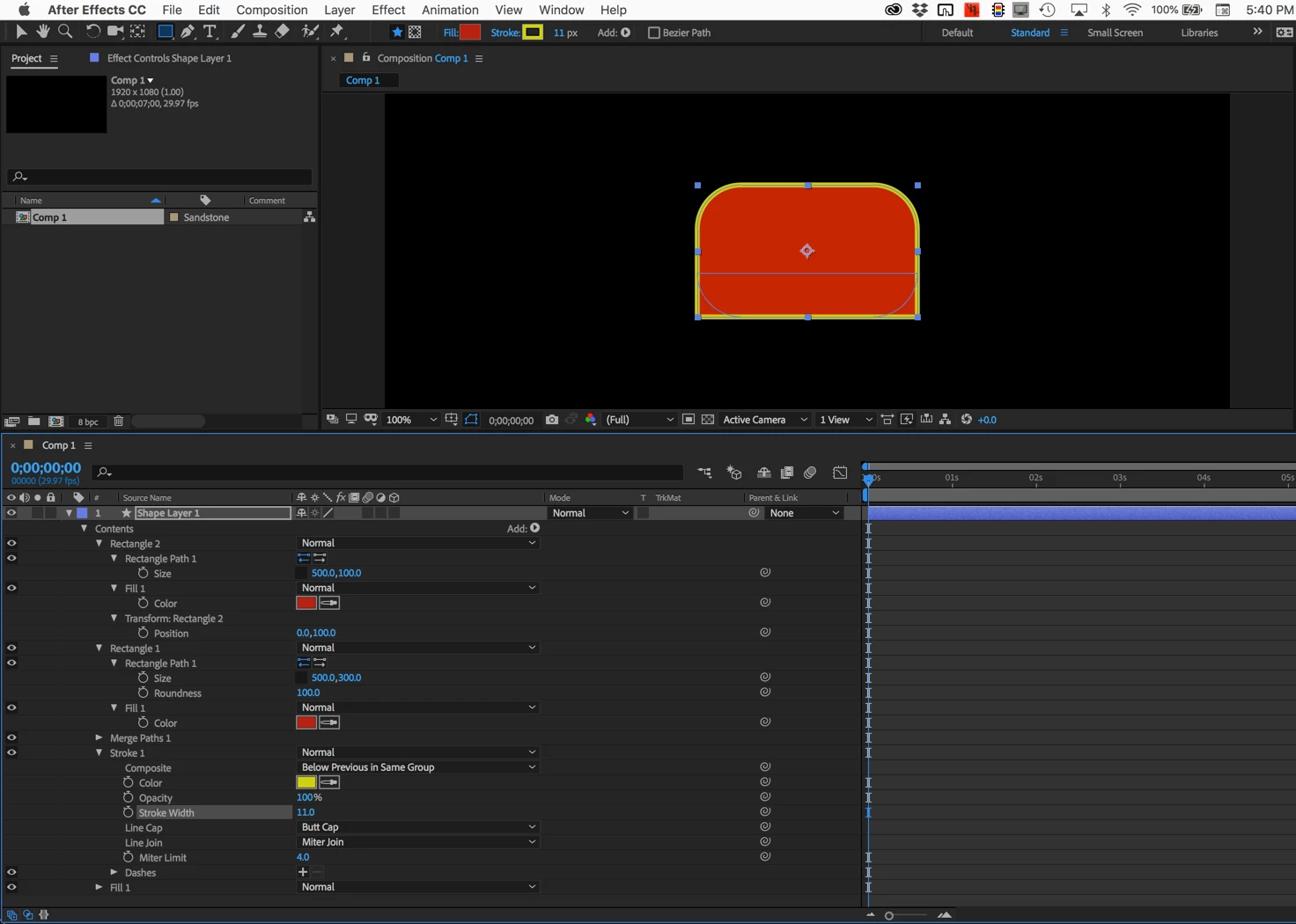 In AE its easy to set the roundness of a rectangle for changing the corner radius. I need to draw a rectangle, which has two rounded corners (the upper ones), and two