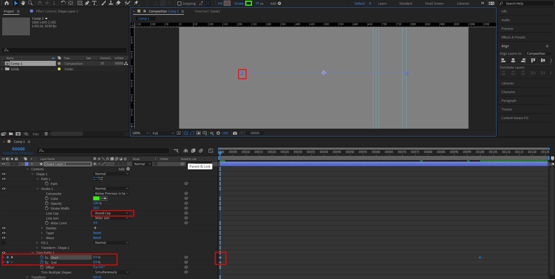 Is there a way to fix in the trim paths and round cap section, the line animations from protruding so much into the first frame. On frame zero, the line is set to zero, but on frame 1, the rounded cap reveals too much of the rounded cap, like 2 notches, then the animation is smoother 1 pixel each interval, and the line finishes again abruptly with 2-3 more notches.
