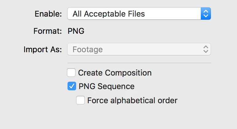 下画像は読み込み時の左下の表示です。PNG Sequenceにチェックを入れます。