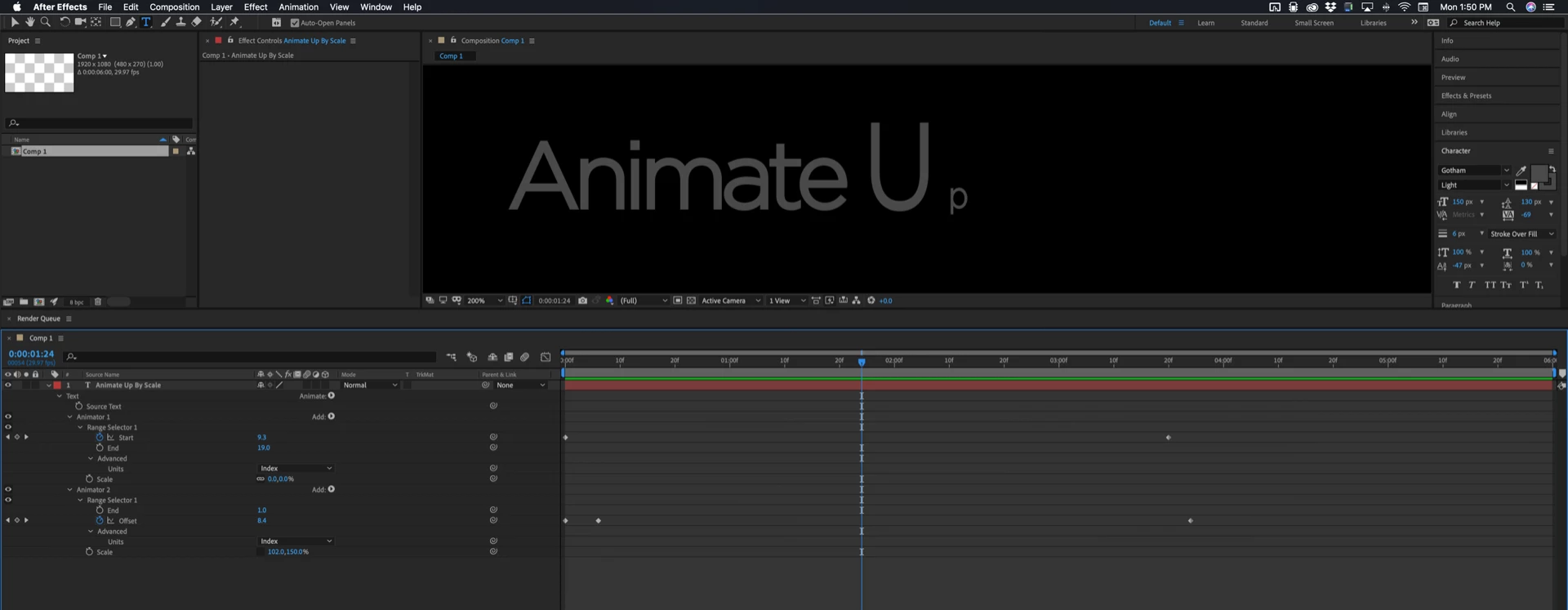 I've tried to do this by stacking animators. The first animator simply sets the scale to zero, the second animator scales them to about 133%, then the third animator, offset by a few frames, scales them back down to 100%. The problem with this approach is that percentages are relative to what has come before. When the first animator sets the scale to zero percent, the subsequent animators never refer back to the original size, they just work off type that is set to 0% scale and are unable to grow it beyond that. If I do a simple zero-to-133% animator (without an animator that sets the initial scale to zero), then follow that with a second animator that scales them back down to 100% I get funky kerning.