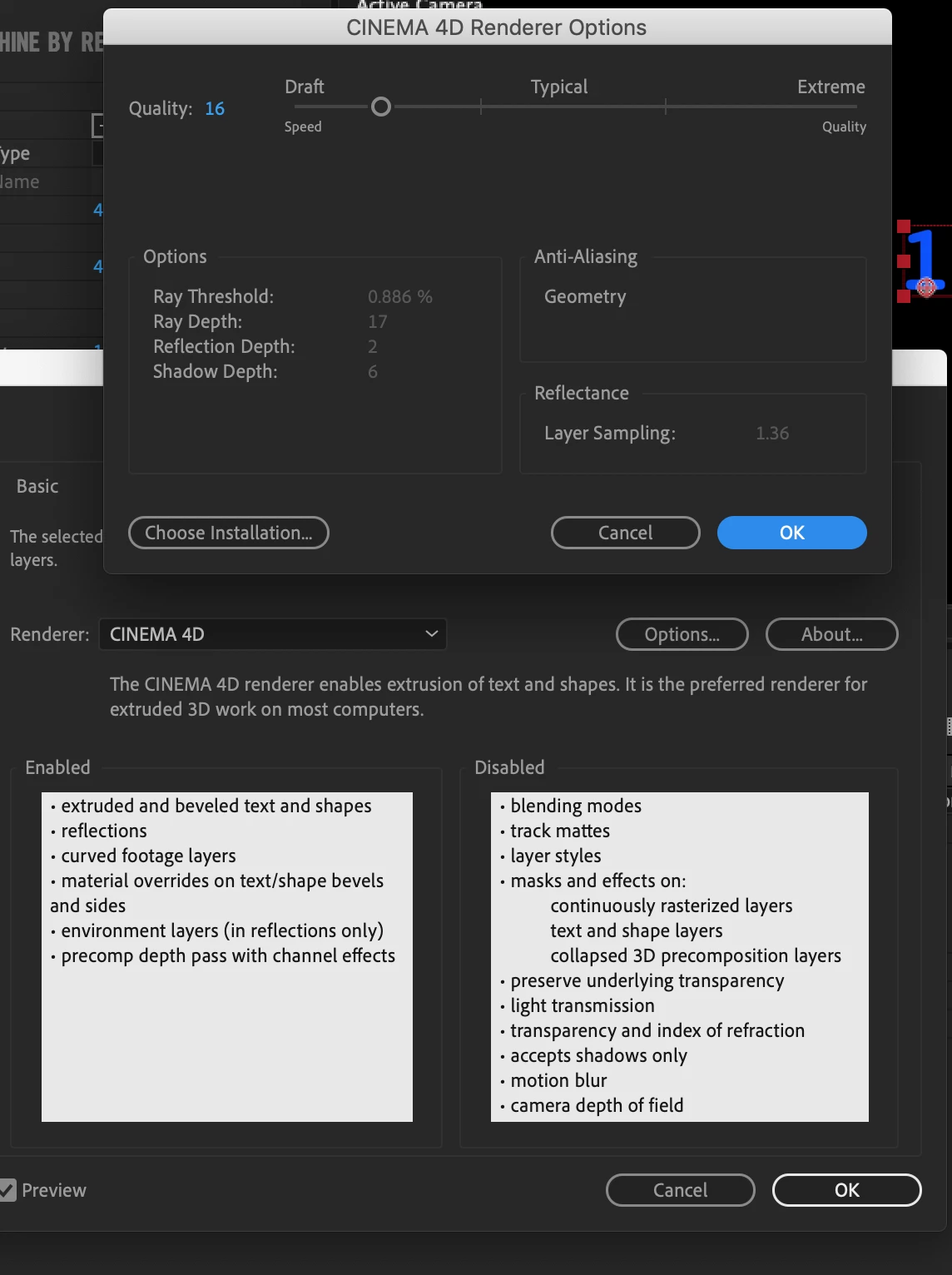 I usually have mine set to 1 when I'm working on a comp. I get an average ram preview render time in an HD comp at full quality of about two or three frames per second. With the quality cranked up to about 20, which is plenty good for most projects the render time goes up to less than 1 frame per second. Crank it up to 60  or 70 and things really start to slow down. If I set the comp panel Fast Previews to Fast Draft and you can still see the motion and lighting and the rendering rate for ram previews jumps up to 12 to 15 frames per second for a standard HD comp. If I were to use the C4D rendering engine for the comps that's how I would do my "pencil tests" to check composition, timing, and basic effects, then I would switch the quality back to somewhere between 15 and 30 for rendering. I use Cineware a lot, but I don't use C4D rendering in Ae because the options for bending layers and extruding are pretty terrible and I lose the ability to apply effects, use blend modes, and all the other things listed in the warning and I need all the tools to do my work.
