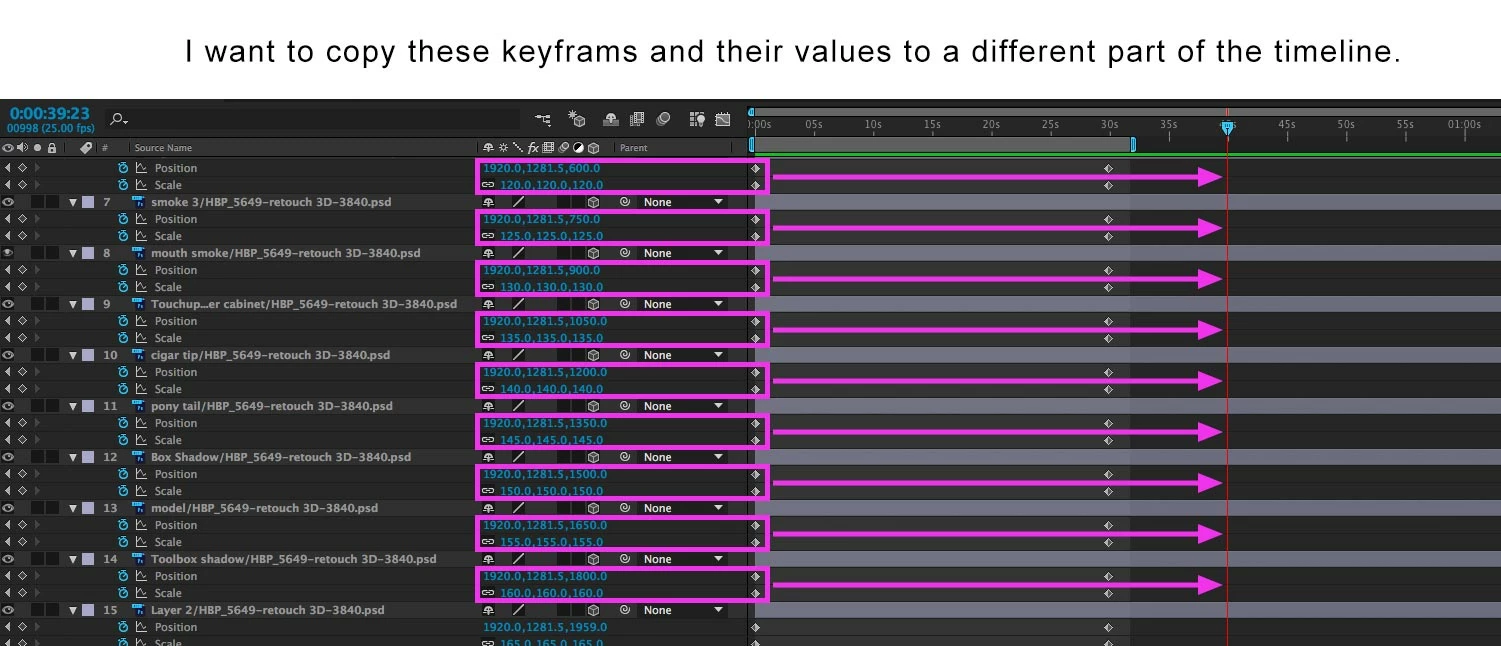 I don't know much about your project and it's impossible to tell what is going on on your set from the screenshot but from what I can see you are moving a bunch of layers around and some of them make up some kind of actor or character. Others, like the cabinet layer make up a set. I'm also guessing that the relationship between the set pieces doesn't change but the actor is moving around the set. If I am correct then I would not have animated the layers the way you have done. I would parent all of the pieces that make up the actor to a 3D null and move the null around the stage. If your actor needed to do something like raise the cigar and take a puff then you could still animate that action. I would then move the camera around the set to frame up the actor and the set pieces. Your project would be much more efficient. Only two or three sets of keyframes and a much easier task of making changes and moving the camera.