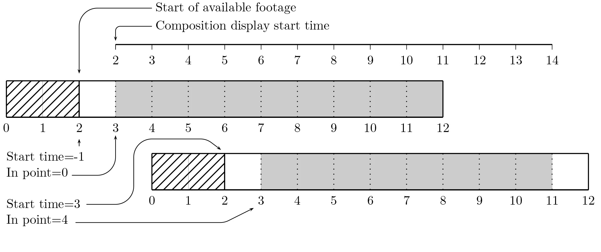 As you can see, to make frame 3 occur at frame 2 in the composition, you specify that the in point is 0 and the start time is -1. That was very confusing for me.