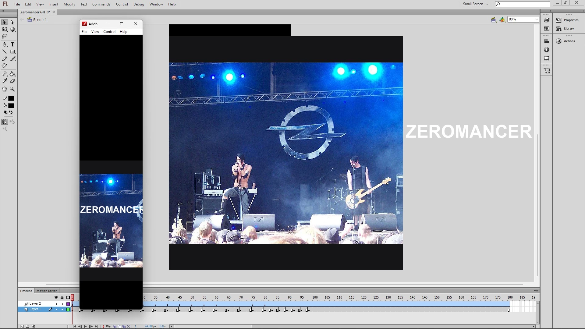 I'm working with Adobe Flash Professional CS6 after taking a class years ago and I've since forgotten most of the lessons I had learned in the distant past. For a fun home project, I just took a photo I found online and tried getting some text to scroll across the photo. Then, I have the text blinking in and out of the center of that image. I saved my work, but I can't seem to preview my work in a normal sized window after loading from Publish Preview nor could I figure out how to clean up the area surrounding the stage (where there's a black square shape protruding from the upper left side.) When I export the project into a .gif file (which is what I ultimately am working on this to accomplish,) it's only focused on the upper left side of the stage and all of my work is cut off. I don't know what to do and my knowledge is extremely limited, I apologize.