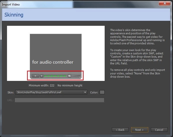 Hi im using adobe Flash CC 2014 and i want to have a audio controller. Im making and android App and when i import video i get the controller for video like this