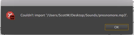 When trying to import sound files via File->import> import to library files come up with the error below. Everything is updated, no problems uploading to other software like imovie or playing sound on itunes. Any ideas?