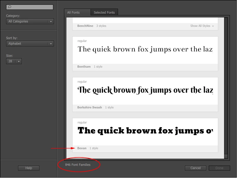 - The interface opens, but, depending on the sort type that I choose, either a small subset of the fonts are listed or none at all.