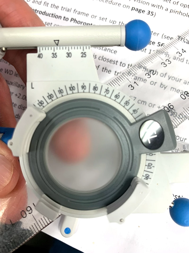 The lens is frosted, so that the object behind the lens is more or less depending on the distance between the object and the lens.