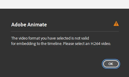 I have a set of overlay effect videos that can be imported fine into After Effects, but when I go to add them to stage in Animate they don't show up. When I try to import video the following error comes up: