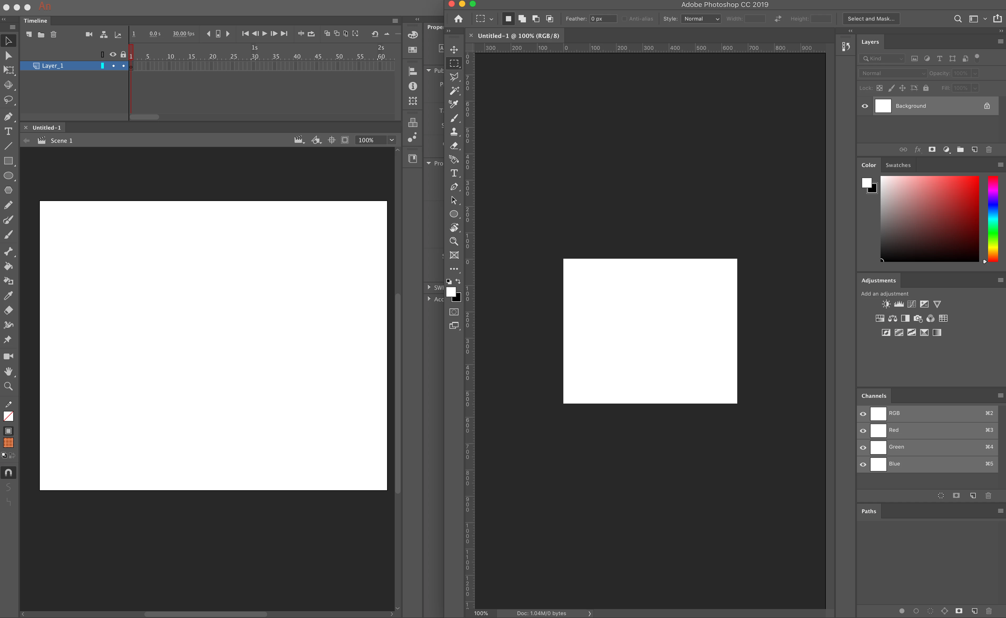 The screenshot included has Animate's stage at 100% on the left and on the right Photoshop's canvas at 100% 72 dpi.