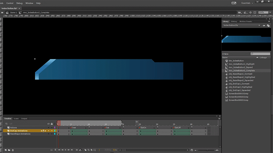 It may be hard to make out so I will explain the cycle. There are two layers in the movie clip symbol mvc_IndexButton3_Combined, one for the BaseShape and one for the EndCap. I created a shape tween for both shapes to change their colours and to expand the End Cap inwards, and labelled the first frame on that tween "Over". Then I copied the tween animation and reversed the frames. I labelled the first frame of that tween "Out".