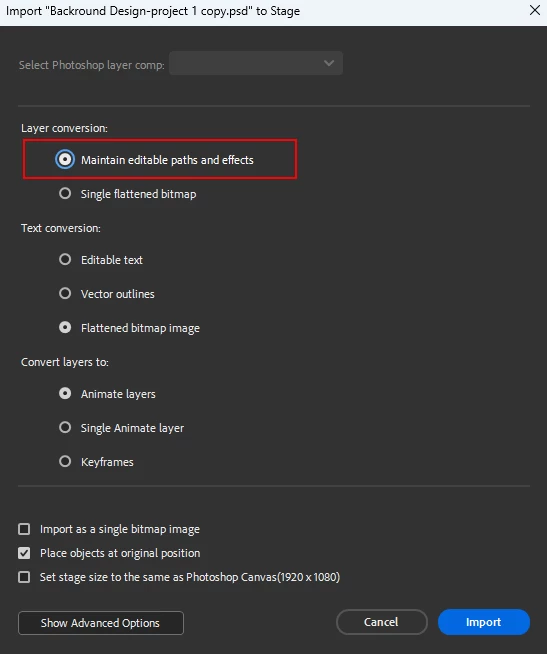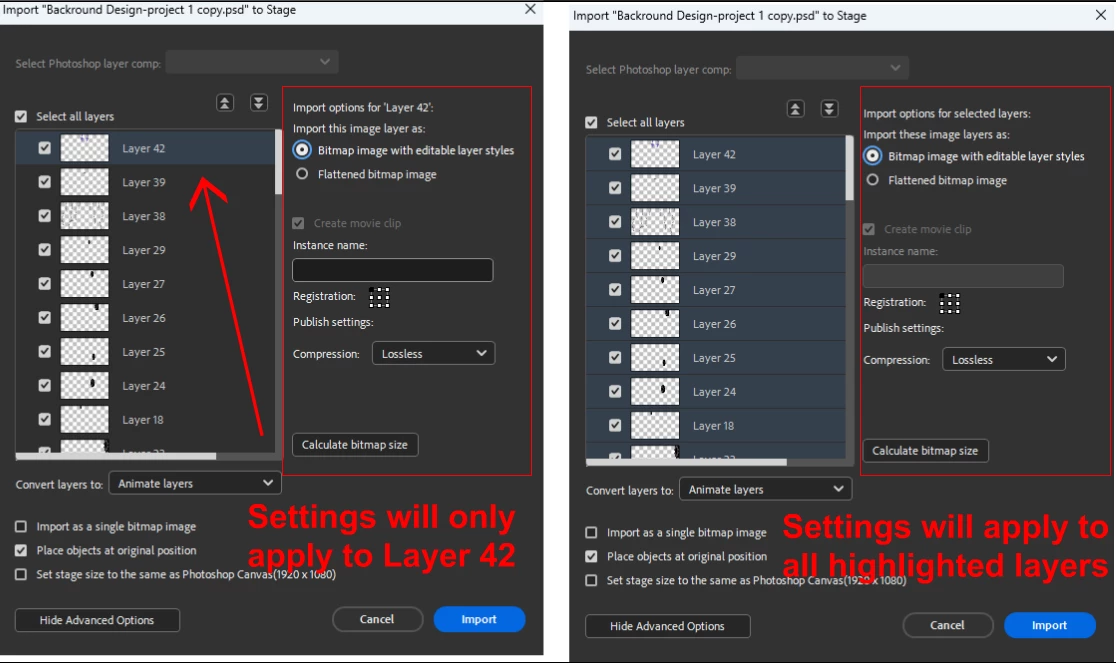 Troubleshoot issue with importing Photoshop file to Animate while maintaining transparency on layers