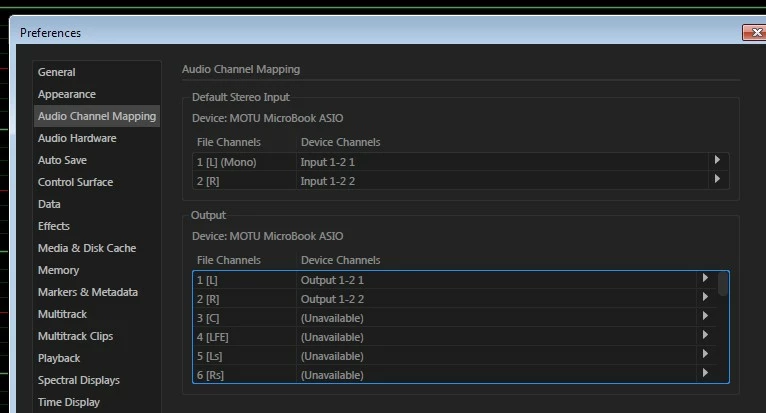 On my Windows installation if I open a new multichannel audio file Audition's Audio Channel Mapping only shows Default Stereo Input. There appears to be no multichannel input mapping although the drop down menu allows me to select any two of the four available inputs from my Microbooks ASIO driver.