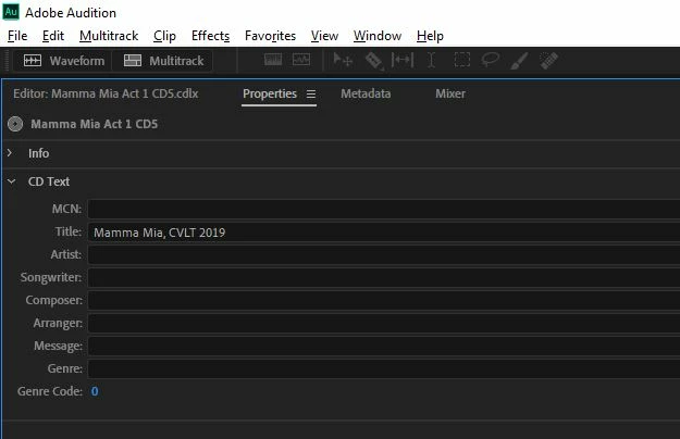 Is there some secret setting you have to select for this to work correctly?  I have been sleuthing this around 10 straight hours today, and have not discovered the trick.  So far, it just looks like Audition is as buggy as a rainforest wrt burning CDs that look and read like anything professional (i.e., carry metadata, as CDTEXT, since homespun CDs can't link to commerical CD databases: Gracenotes, AllMusic, ...).