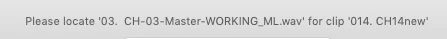 I have tried different versions of the back-up, all the same problem. I tried relinking all files, but it wants the wrong chapter, which seems very bizarre ("Please locate "03. CH-03 MASTER Working_ML.wav for clip "014. CH14new.") I tried picking the RIGHT clip for "014. CH14new," but then it replaced all clips with THAT file.