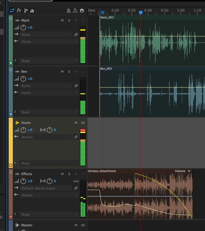 We have 'Mark' my co-host on track 1, me on track 2. Both these are routed to 'Hosts' Bus on track 3. Track 3 sends to a Dynamic Processing effect on Track 4 to provide some voice ducking.