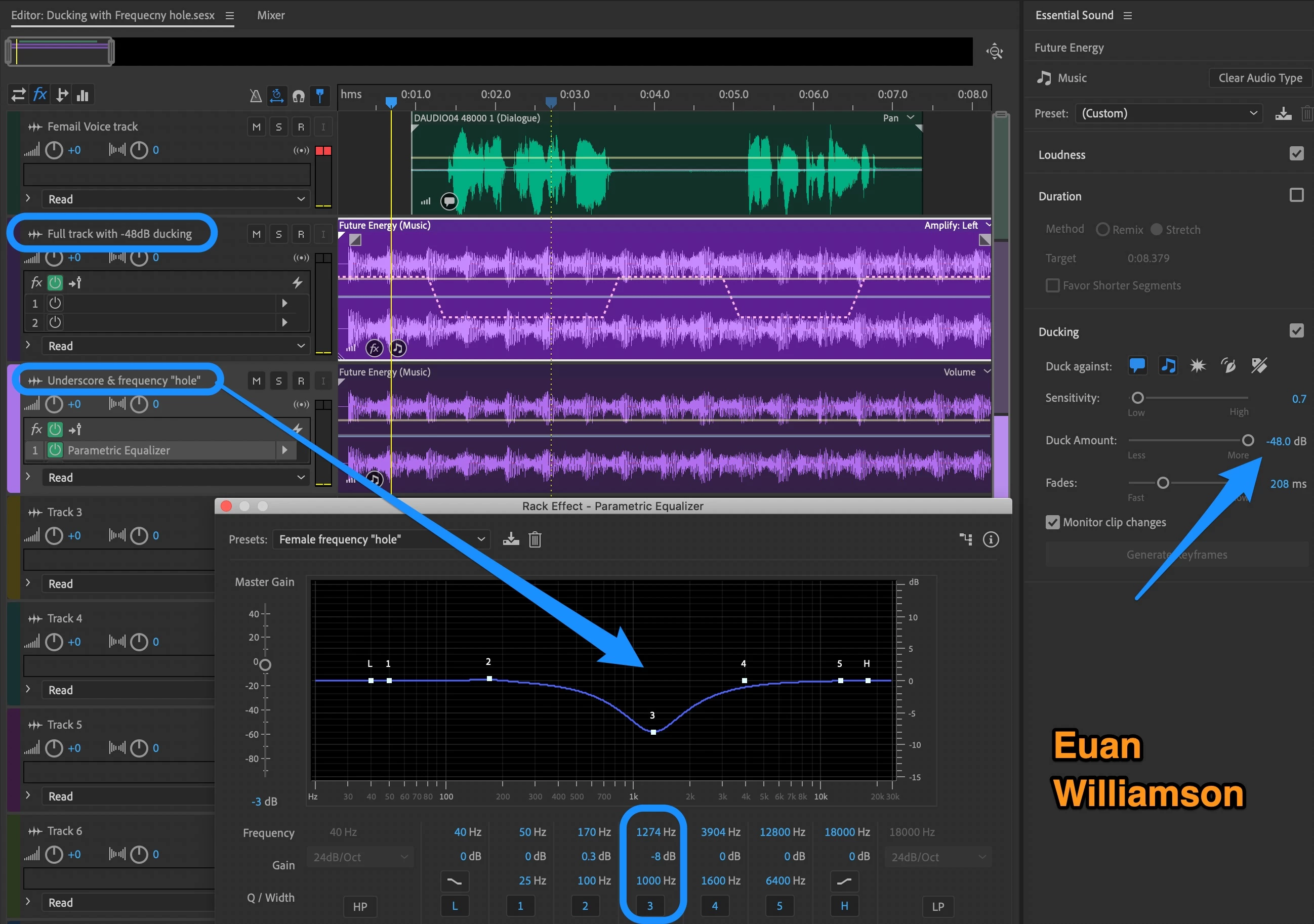Apply the parametric equaliser to the duplicate music track and adjust it to make the frequency hole.