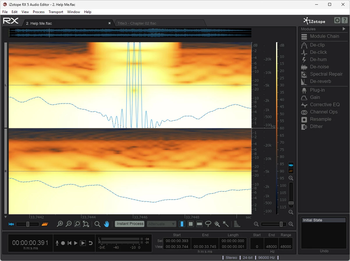 A second oddity is that if I downsample the same audio file to 96/24 using software other than Adobe Audition CS6, the resulting audio file does not cause the popping sound when played back through MC34 or the spikes when displayed in iZotope RX5.