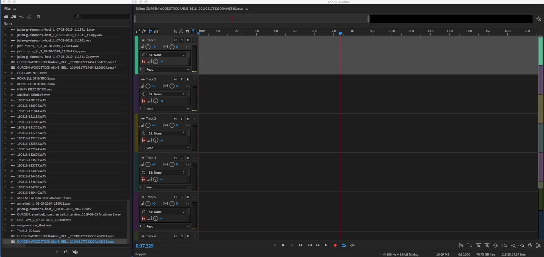 I have been happily editing a podcast, using the most current version of Audition (Build 12.1.3.10) on an iMac running High Sierra 10.13.6 with 16 GB of RAM and plenty of hard drive space.  As I built sequences in separate .sesx files, I saved every 3 minutes to the Adobe/Audition/12.0 folder on my hard drive.  Carefully created session folders saved all media to those.  I also backed up the .sesx files as well as media to an external disk.