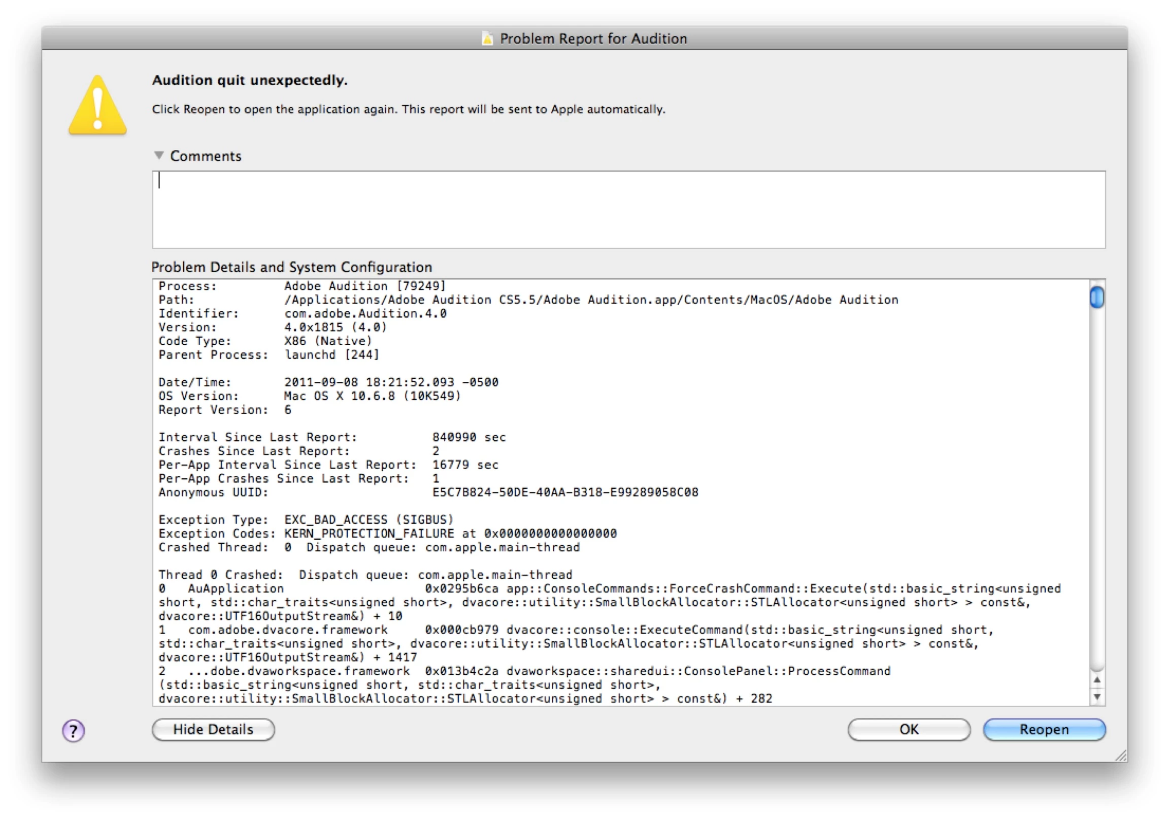 Go ahead and still submit the crash report through the OSX crash reporter as well as the Adobe Crash Reporter Tool. Be sure to supply comments that answer the questions mentioned above. |