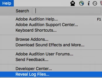 Include log files that Audition Creates by choosing Include log files that Audition Creates. Help > Reveal Log Files... |