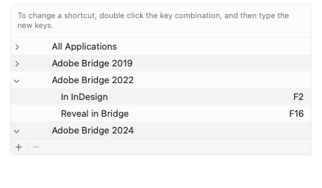 This program has become more complicated and less useable. There are 2 big problems with it that will prevent me from adopting the new verion. Previous versions, i was able to add a shortcut in the system app preferences that would allow placing files in indesign with a shortcut function key of my choice. This no longer works in AB2024. Place in InDesign is not available in the new shortcuts window in this version. The folders that contain recent indesign, photoshop and illustrator files can no longer be added to the favorites panel. I am staying with AB2022 until these problems are addressed. Below are screenshots of the system application shortcuts menu and bridge 2022 shoing recent file folders. Gary, if you're reading this, humble me and tell me i am wrong. Ken?