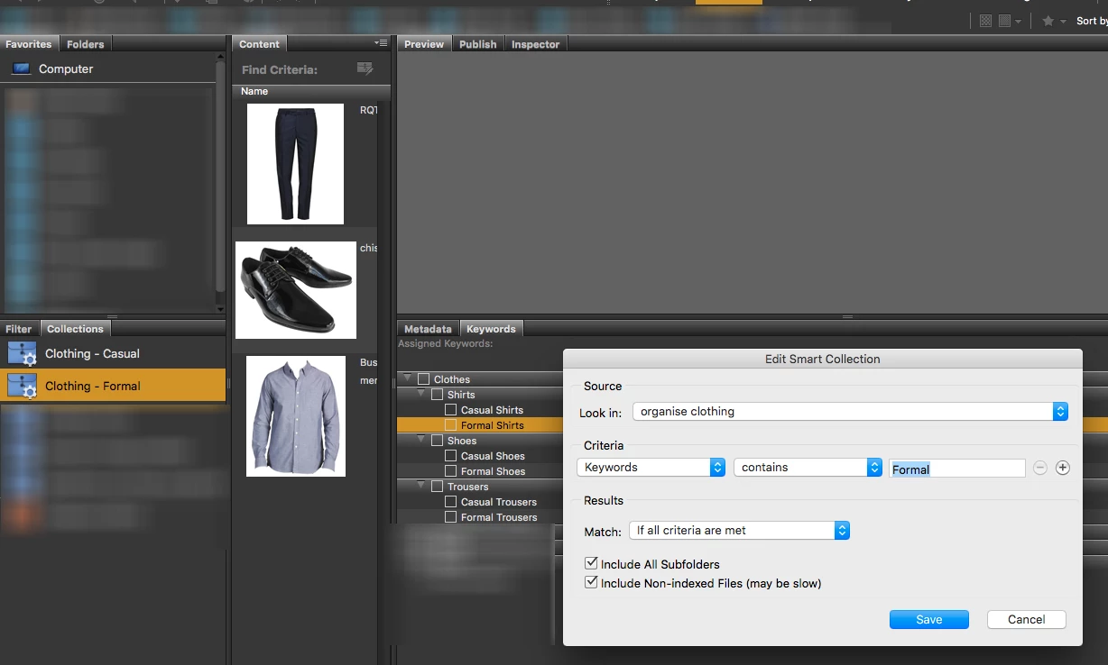 I have individual pictures of everything, marked by nested tags. For example shirts, pants, jackets, shoes, with each item tagged for color and features and occasion such as business and casual.