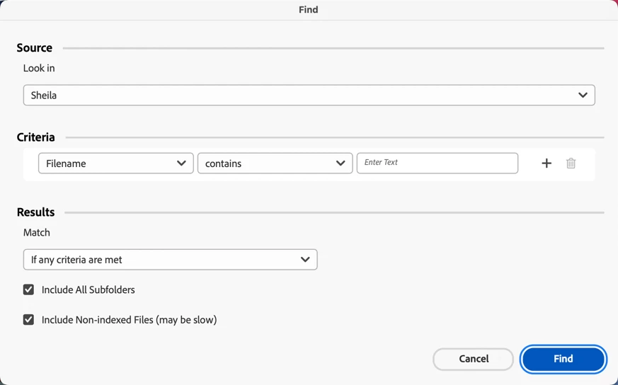 The Search window has been replaced with a "Criteria Box" or something. I rely on the Search Window to Search for files by Filename. I can find any file from the previous Search Window faster and with fewer clicks than this ackward Critera Box. The only workaround I've found is to sift through hundreds of files alphbetically. Yuck!