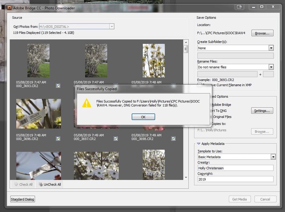Convert to DNG fails in Photo Downloader from Bridge CC 2019 Windows 7 Pro