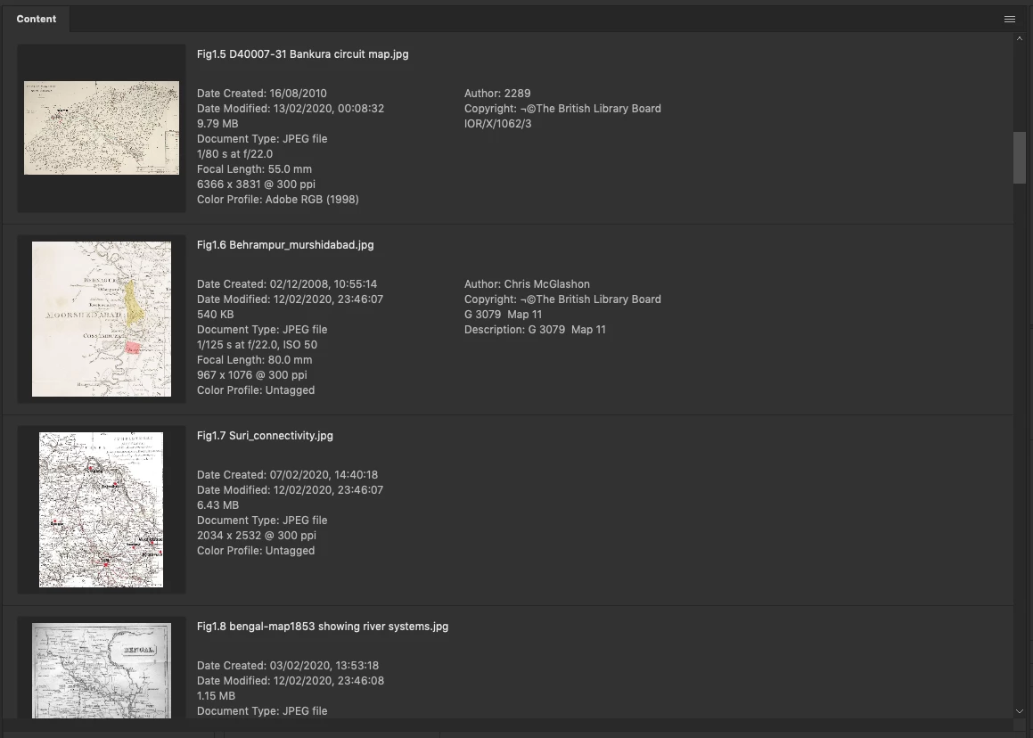 Hi there, I'm working on a book publication with a lot of figures, and the author, who prefers working analogue, is asking for a contact-sheet type printout with the images to one side, some specific metadata info, and enough space to scribble down notes for edits for me to make. Essentially what I'm looking for is a way to export how things already appear in the content window of Bridge with 'View contents as details' selected, shown below.