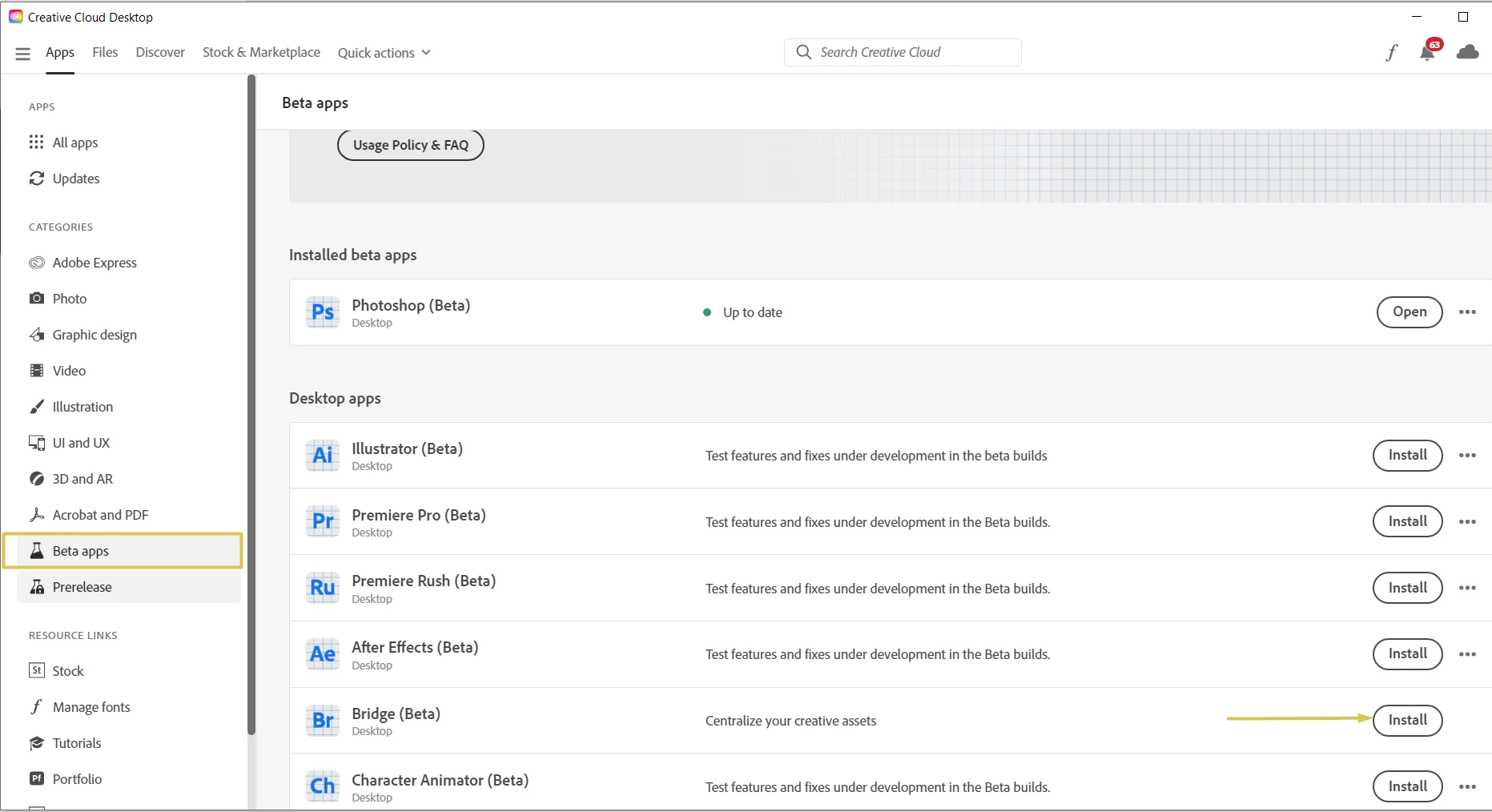 To install the Beta, visit the Beta apps tab of the Creative Cloud desktop app and select Install next to Bridge (Beta).
