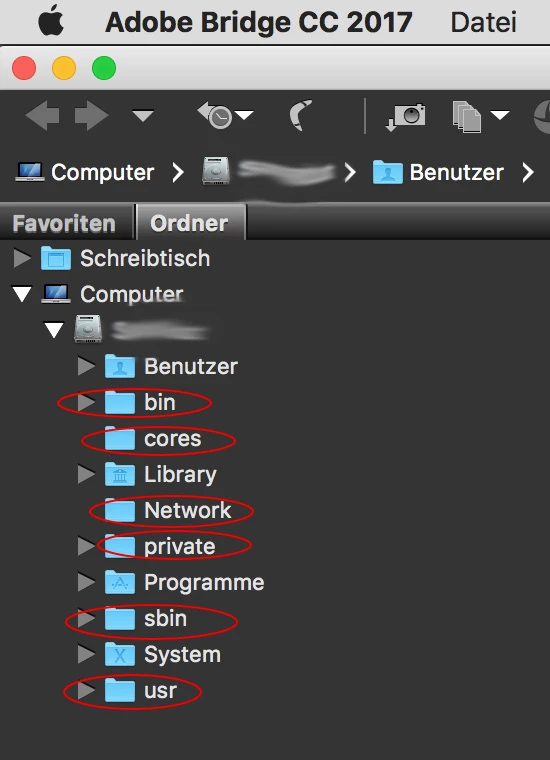 in Adobe Bridge CC (2017 and 2018 versions) folders view hidden system directories are visible in macOS High Sierra 10.13.3 (I think also in 10.13.2). The hidden folders are in the macOS root directory: "private", "Network", "usr", "sbin", "cores", "bin" normally these folders are not visible.