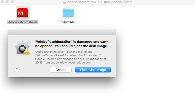 After we done some reading together it said online to upgrade to Camera RAW 6.7. We have downloaded it but every time we click the red adobe folder to do the installation process it says: "AdobePatchInstaller” is damaged and can’t be opened. You should eject the disk image. (see picture attached).
