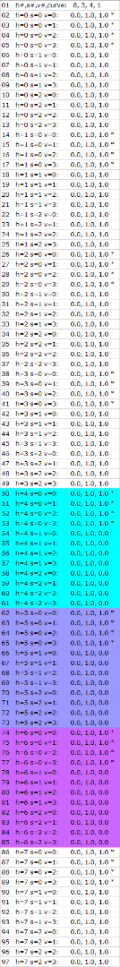 To determine this, based on the pseudo-code in the PDF, I wrote a C# program in LINQPad 5 to output not only the rows of the looktable.csv but also the corresponding HSV color-segment numbers, where the Hue segment numbers go from 0 to 7 (8 segments), the Saturation-segment numbers go from 0 to 2 (3 segments) and the Value segment numbers go from 0 to 3 (4 segments).