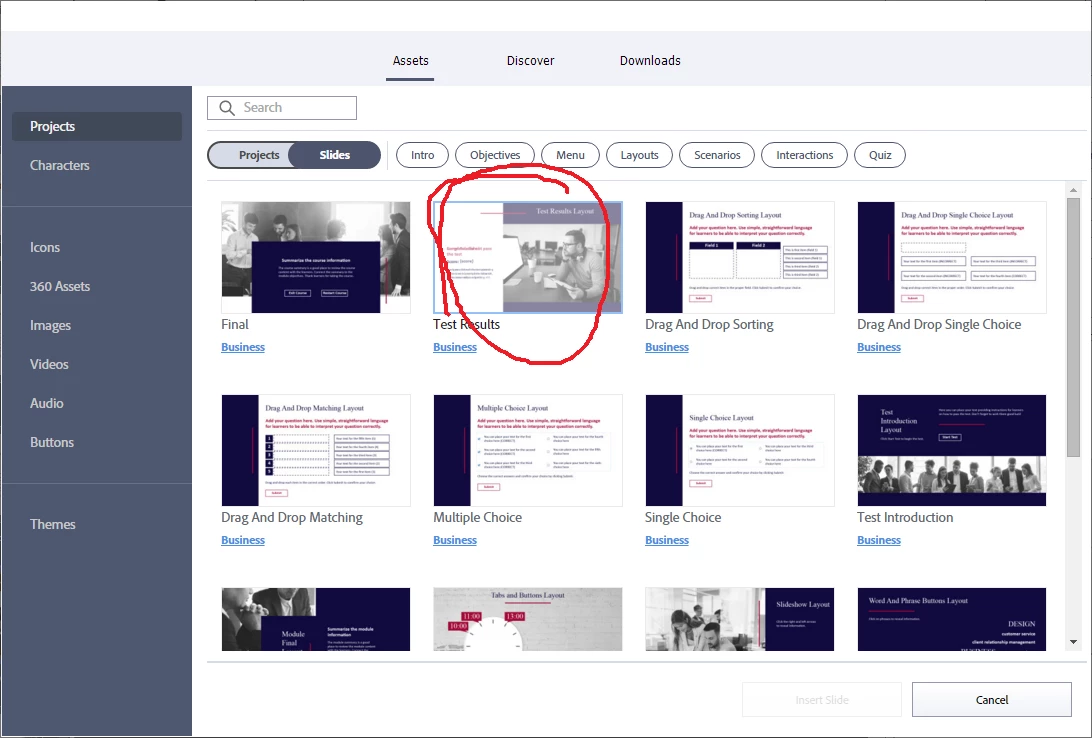 When I'm talking about the templates, I mean that I chose this slide out of the assets section. I'm using the business theme "test results" slide, which I inserted into the project then changed the colors and fonts to match the rest of my project. The asset I used is now greyed out when I look at it, so I think that applying the template slapped it over the master slide. It's one of the adobe slide assets (screenshot). I think the template IS what the shape with the advanced interaction is? There are two result possibilities, and on failure one image + text appears while on passing another image + text appears, which I was able to customize. This appears to work as intended, except that I get a failed result at 70%. The passed result only occurs at 80%+.