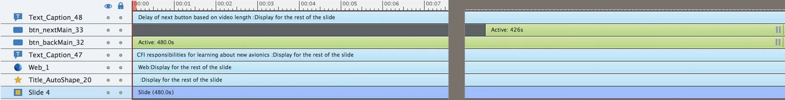 For example, I have an 8 minute video and I have a next button, to advance to the next slide, on the timeline set to display at 7 minutes. The Pause point on the timeline is set at 8 minutes. This button delay is a requirement of the client to make sure users are not just skipping over the video. I have not had the timeline issue with a standard 6 second delay on text based slides.