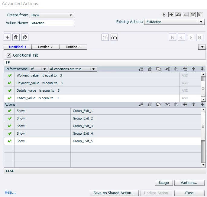 Then I have another advanced action set to look for each of the 5 values and if they all equal 1, to show an exit button. But the exit button never shows.