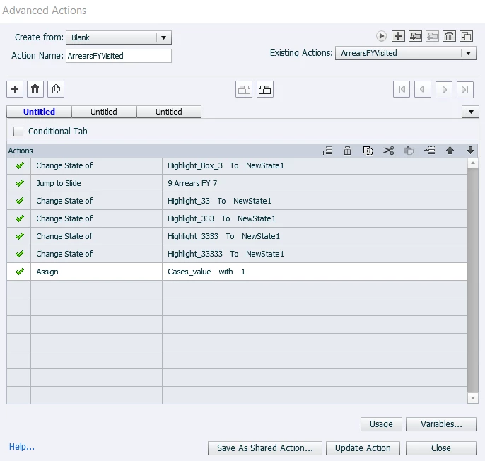 I have 5 buttons that lead to 5 slides I want the viewer to visit. I built an advanced action that takes them to the slide, changes the button color to visit state, and assigns a value (one for each button) to 1.