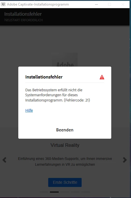 nach der Neuinstallation meines Windows Systems lässt sich Captivate nicht mehr installieren. Nach der Auswahl der Komponenten und des Installationspfades bekomme ich den Fehler 21. Windows ist auf dem aktuellen Stand, die aktuellste Version von MS Edge und Firefox sind ebenfalls installiert.