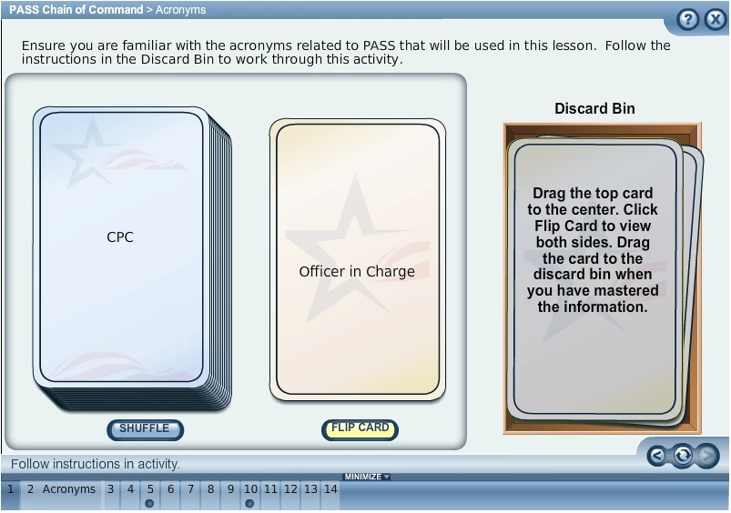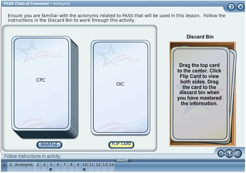 Hi. I'm new to Captivate but have used Director and Flash for a long time. I have inherited a handful of courses that use some sort of proprietary system based on AS2 SWFs and an html/xml type framework deployed on a SharePoint site. My client is the US Navy. I've been maintaining and modifying the site by editing what is already there. I am tasked with building a new course and am fed up with the framework as I really don't understand much of it. There is however a component in it I'd like to keep using. It is a flashcard activity. The student must turn over all the cards in the stack before advancing. Is there an existing solution similar to the one shown. The user will click a card on the left, drag it to the right, push the FLIP CARD button, and then drag it onto the pile to the right where it disappears.