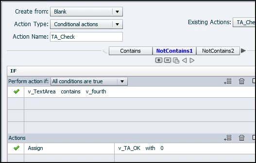 I put the words in variables ( v_first ... v_fifth),, that is a reflex I have since I'm using shared actions that much. The associated variable for the TEB (which you can now reset to an empty var in CP8) is v_TextArea and the boolean that will decide if the positive feedback (StarOK) has to be shown is v_TA_OK. If you want to show a negative feedback, put that in the ELSE part of the last decision.