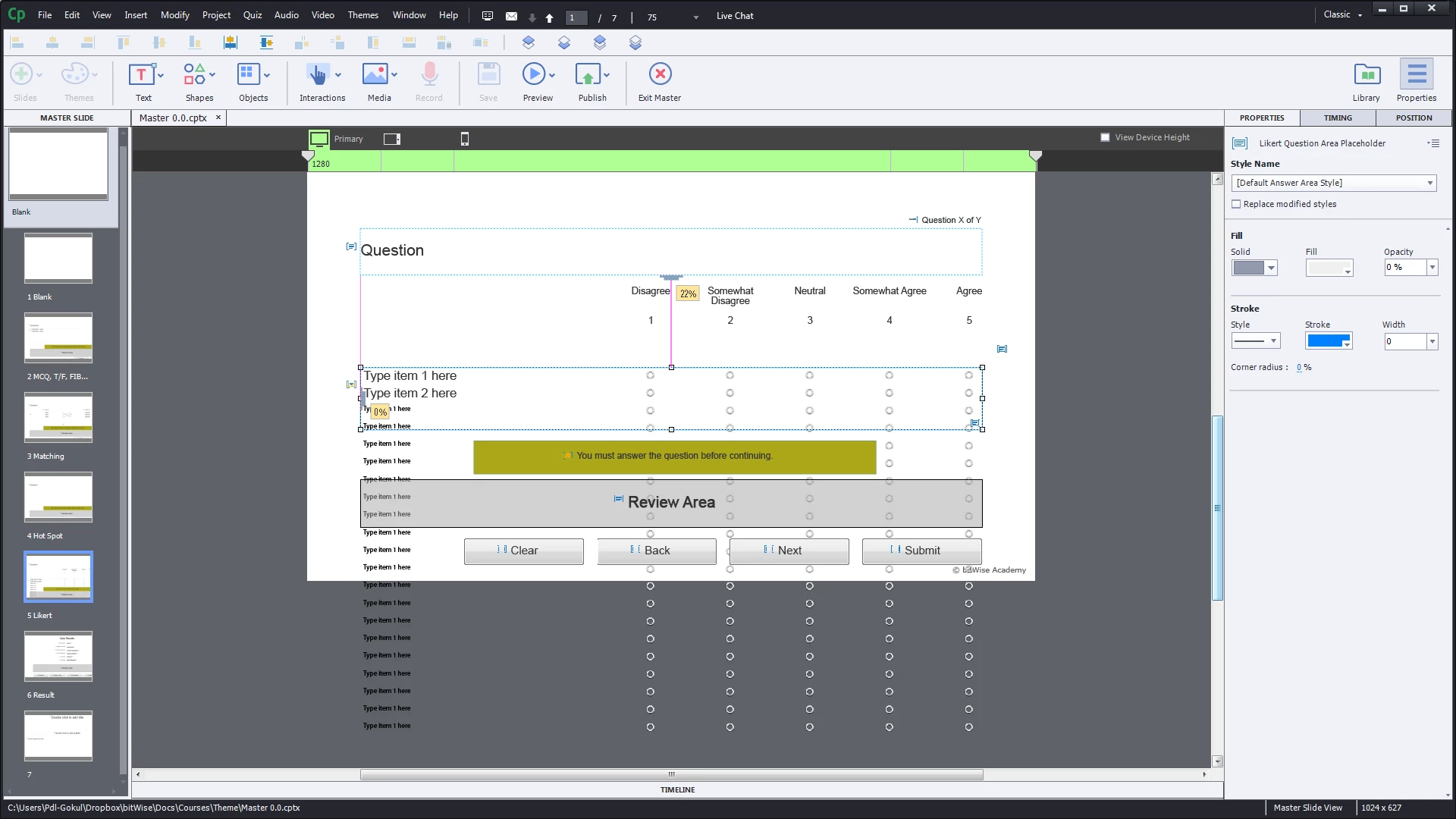 I'm currently, creating a new master slide. I'm changing the positions of quiz slide elements in all 3 views. I used the blank theme as the base and then started making changes to the master slide. All quiz slides are working perfectly except one. Problem is with likert slide in the master slides. When working in the primary view, there isn't any problem. Moment i switch to tablet view, the following happens.