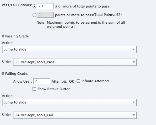 The problem I have is that after clicking the "Continue" button with a failing score, the slide plays for a bit and then just stops. It won't move forward to the next slide and it won't go back. I guess it could be described as freezing. If I close out and then redo it with a passing grade, the "Continue" button will jump to the correct slide with no pausing. If I switch the two slides around in the Filmstrip view the "Continue" button doesn't work for either.