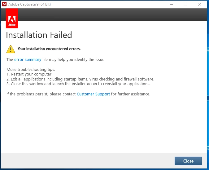 Re: Installation fails each time for captivate 9