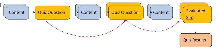 If the user fails, the "Retake Quiz" button appears on the Quiz Results page. When the user clicks it, it goes to the first quiz page but then follows to the next content slide. How can I make it follow the dotted red line instead so that the user is ONLY required to take the quiz pages?