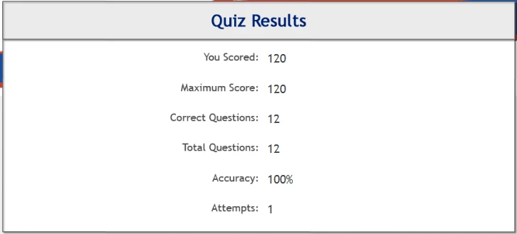 The funny thing is that the score that reports seems to be the equivalent of one question regardless of the actual score achieved in the module. I completed the exam twice and received a 100% and 40%. When I had 12 questions it was consistently scoring 8% (1 of 12).Once I removed 2 questions the score kept returning 10%