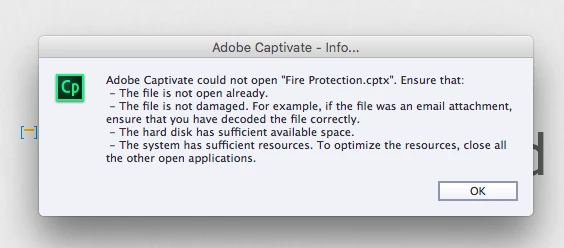 Only difference, other than Captivate version, is that I'm using a Mac and the other users are using Windoze. Could that be the issue? I don't have that problem with files from people using CP2017. Those open fine, and those were created on Windows computers.
