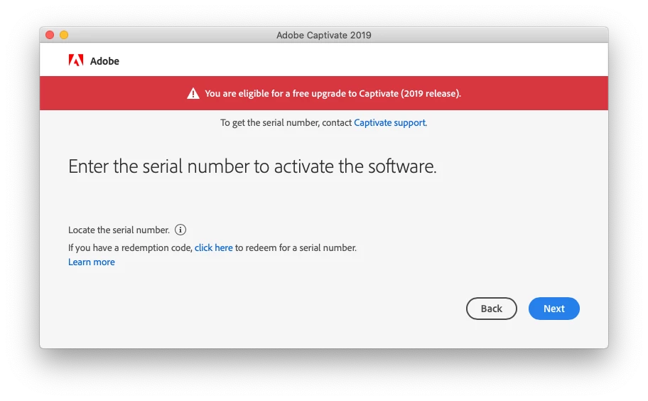 I'm trying to re-install Captivate on a new machine and I'm receiving this message when I enter my 2019 serial number: