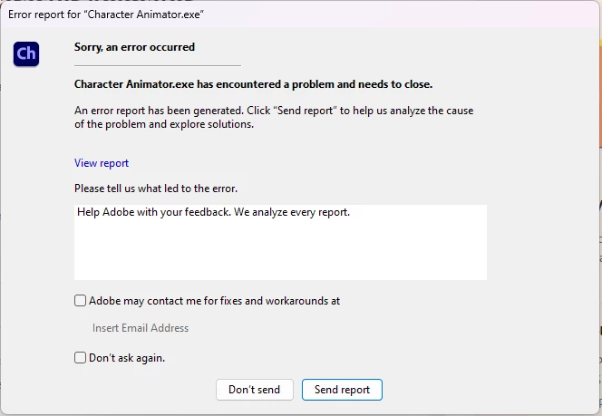 I'm not the most tech savvy of users here, so I can't figure out how to open or read the .dmp file for the report from Character Animator. I attempted to attach it here, but that doesn't seem to work either.