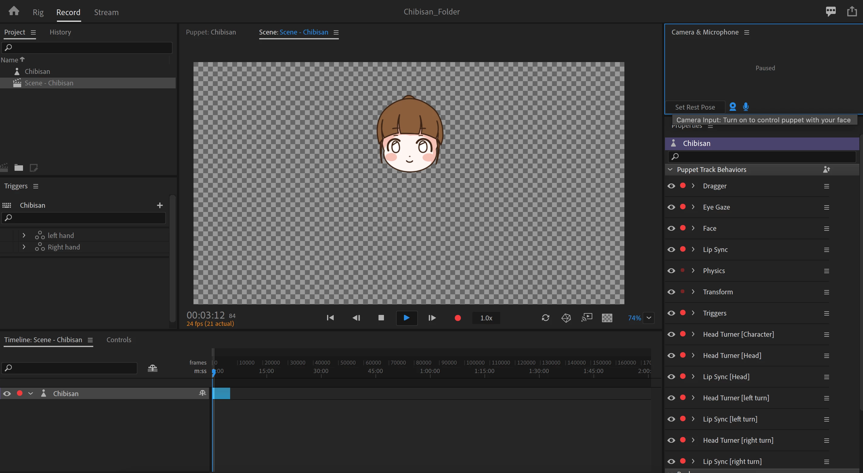 Hi. I have been working on my puppet on adobe Ch for a while and the torso suddenly disappeared when I switched into record mode. First I thought the layer was not turned on but when I checked it in the rig mode, everything looked fine. l tried to start over everything and rig from zero but that didn't work. I also tried to turn off the head-turner. Neither solution did not work. Help me!!! Thank you.